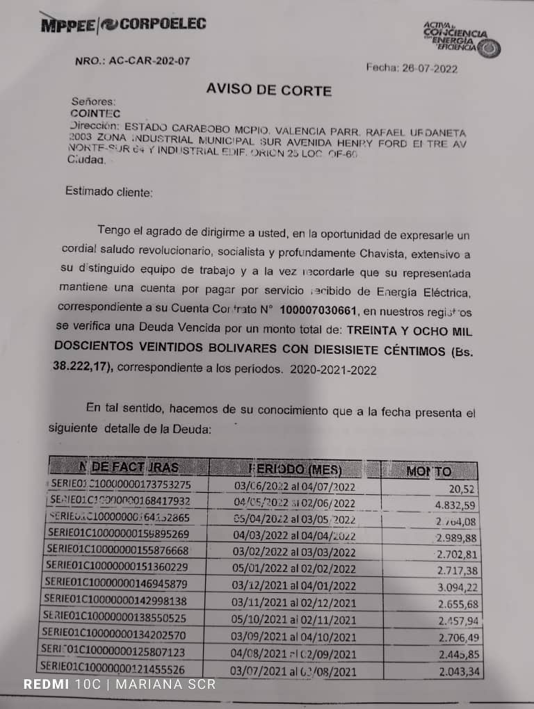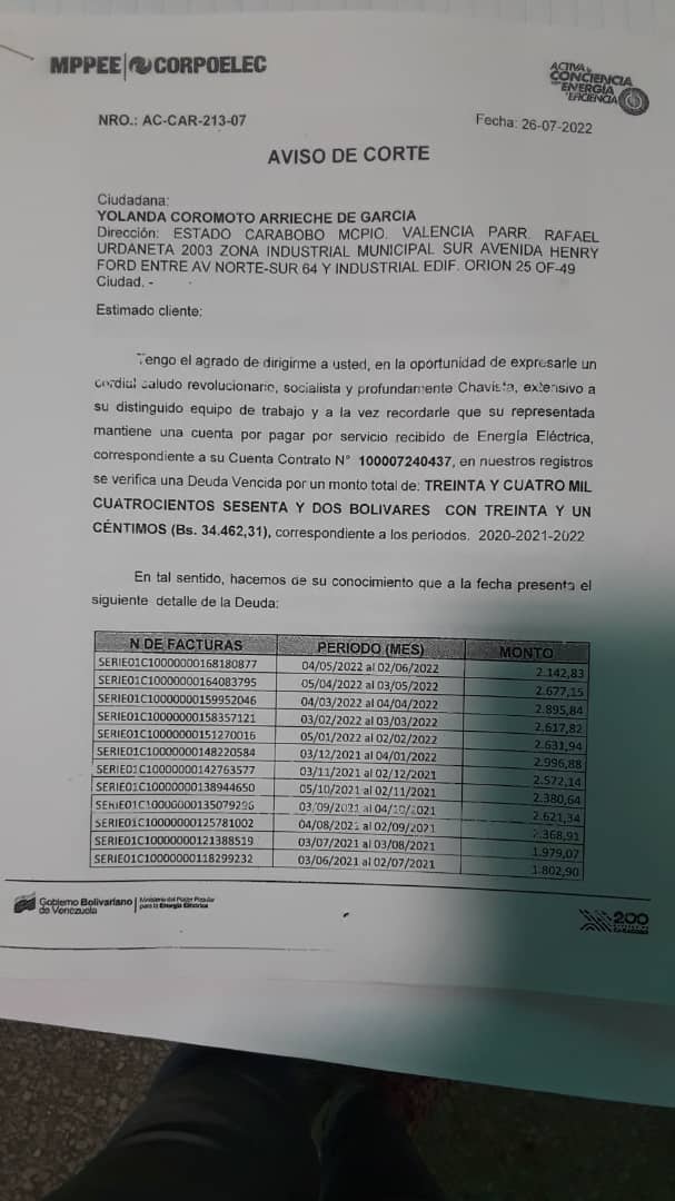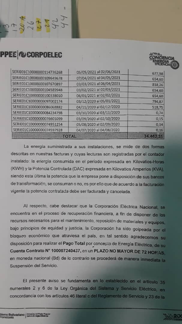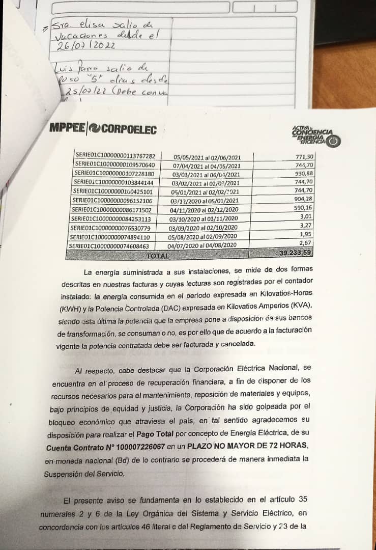 ” Ni vendiendo mi propiedad podría pagar la factura por el servicio eléctrico afirmó un usuario a quien la empresa le impuso un cobro por Bolívares digitales de; 39,233, 59 (un aproximado de 7 mil dólares el total de la deuda, de acuerdo a la tasa oficial del BCV)”